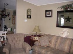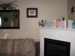 The other wall has my couch and opposite to that is my window. I have a sage and beige sofa, chair and loveseat and my curtains have sage and burgundy in them.